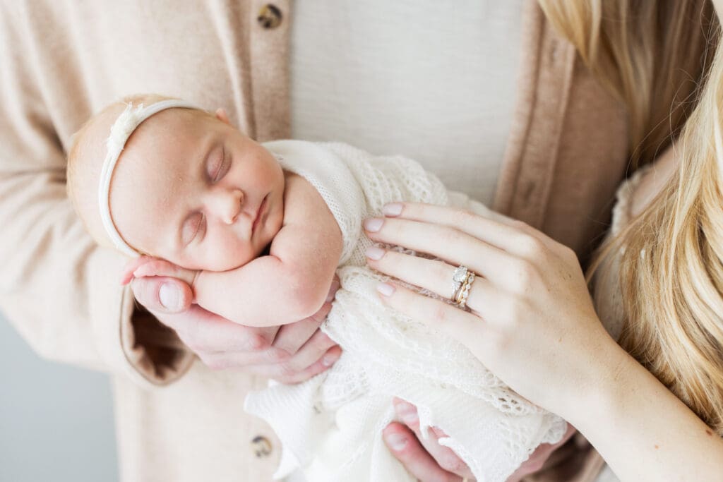 Calm newborn photography does not rely on complicated posing or constant movement. We use simple, natural positions that keep your baby comfortable and supported. Many of the most meaningful images come from quiet moments such as holding your baby close, resting together, or softly gazing down at them.