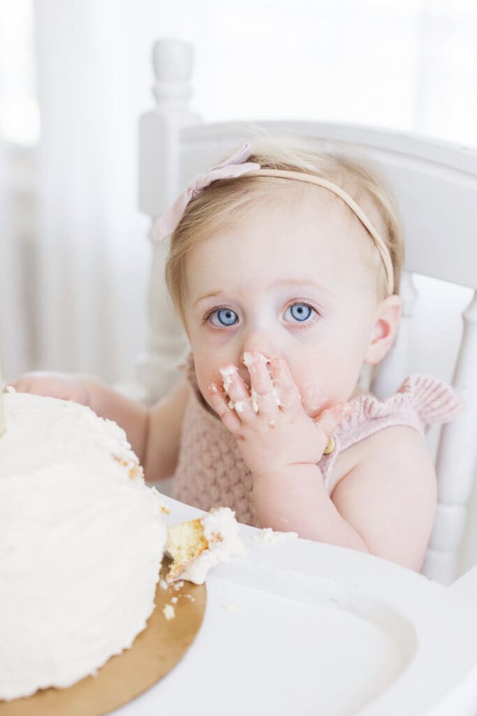 You can absolutely include a cake if it feels right for your family. Many of our Houston families choose to do so, and it often leads to joyful, curious moments. A baby experiencing frosting for the first time can be playful, expressive, and completely genuine.